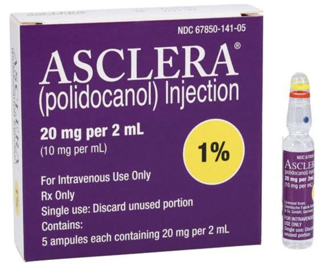 Asclera® (polidocanol injection) is an FDA-approved prescription medication indicated for the treatment of small varicose veins, including spider veins. Treatments with Asclera typically take between 15 and 45 minutes and are administered using a very fine needle, which may cause mild discomfort or a slight stinging sensation.